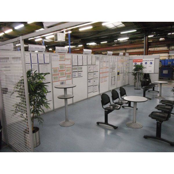 Diese modularen Design-Trennwände sind flexibel, schnell und einfach zu montieren und ermöglichen die ausgereifte Erstellung eines vollkommen individualisierbaren Kommunikationsbereichs in Ihren Fertigungswerkstätten in Abhängigkeit von Ihren Projekten. Dank dieser variablen weißen Paneele ESPACE’INFO verfügen Sie über eine sehr große Oberfläche, um Ihre Informationen zu strukturieren und Ihre Leistungskennzahlen an Ihre Teams weiterzugeben. SESA SYSTEMS verfügt über ein großes Sortiment an magnetischem Zubehör, um Ihre Dokumente auszuhängen. Diese umsetzbaren Trennwände aus Blech oder Emaille können dank ihrer gerillten Aluminiumkonstruktion mit verschiedenen anderen Elementen wie Regalen, Beschriftungsblenden, Leuchten Versteifungsstreben erweitert werden. Für einen offenen Informationsbereich in Ihren Werkstätten können Sie ebenfalls Gitterplatten ergänzen, die ebenfalls als Infodisplay dienen können. Dieses Einrichtungselement, das als Whiteboard und Trennwand dient, kann für Ihre täglichen Besprechungen verwendet werden.
