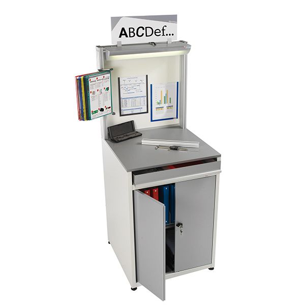 Qualitätskontrollstationen auf Füßen oder auf Rollen sind ebenfalls sehr vielseitig und können einfach mehrere Zubehörteile entlang der Aluminiumschiene tragen. Wenn Sie eine zusätzliche Ablageplatte, eine Schublade, Rollen oder auch einen DOCAFLEX zur einfachen und schnellen Suche verschiedener Unterlagen ergänzen müssen, ist dies dank einer Universalbefestigung auf Aluminiumschiene möglich. Sie können ebenfalls den Arbeitsplatz gestalten, den Sie benötigen und der Ihren Bedürfnissen voll und ganz entspricht. Entdecken Sie das Sortiment mit Qualitätsarbeitsplätzen von SESA SYSTEMS noch heute.
