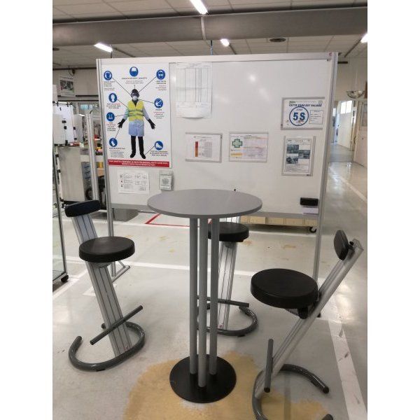 Der Kommunikationsbereich ist eine zentrale Verbindung zwischen den Arbeitnehmern und der Geschäftsleitung. Die Kommunikation innerhalb eines Unternehmens ist ein wichtiger Schritt für den einwandfreien Ablauf von Projekten und für tägliche Fortschrittsbesprechungen über Projekte der verschiedenen Mitarbeiter, die der globalen Strategie des Unternehmens folgen. Ob für kurze Treffen, die nur zehn Minuten dauern, oder auch für längere Besprechungen ist es wichtig, in einem Bereich zu sein, der für die Kommunikation bestimmt ist. Mit diesen variablen Trennwänden kann ein Ort der Ruhe geschaffen werden, der für ein Gespräch unter Mitarbeitern geeignet ist, und dank der Cafeteria-Tische und Konferenztischeerhalten Sie eine echte Ruhezone inmitten der Produktion. Im Rahmen einer Strategie des Visuellen Managements stellt der Kommunikationsbereich eine globale Sicht der Leistungskennzahlen des Unternehmens dar. Diese Kommunikationsbereiche ermöglichen jedem, alle anderen Arten von Informationen wie die Strategie, die Unternehmenspolitik, neue Produkte, Kunden usw. zu verfolgen.