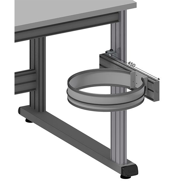 Zijdelings gemonteerde vuilniszakhouder zonder deksel op zwenkarm.