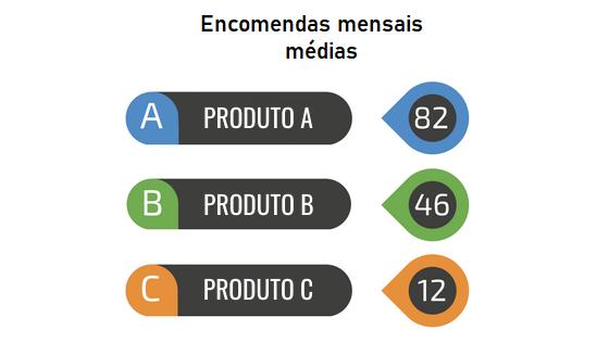 Vamos tomar uma fábrica que fabrica 3 tipos de produtos em diferentes volumes, quantidades. Aqui está a representação dos 3 produtos, um para uma cor diferente. Agora vamos imaginar o número médio mensal de pedidos para cada linha de produtos.