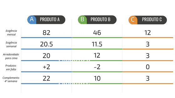 Agora, vamos imaginar, com essa operação, que a empresa receba um pedido de um cliente no início do mês, desejando os 3 produtos. Teremos de esperar até ao fim do mês para entregar o cliente. Isto representa custos de logística e gestão de pelo menos 20 dias úteis. Este período não é aceitável nem para a empresa nem para o cliente.