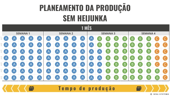 Sem a Heijunka, a empresa produzirá em massa e em cadeia os produtos mais consumidos, terminando com os menos consumidos. Isso evita a necessidade de trocar as séries e moldes entre cada produto para minimizar a perda de tempo. Isto é o que parece: